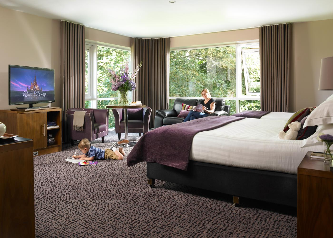 Family Rooms at Dunboyne Castle Hotel & Spa offer ample space to make your family stay even more comfortable. These rooms feature floor to ceiling windows allowing natural day light and stunning garden views to flood in. Each Family Room can cater for up to 2 adults and 2 children sharing with one double bed, one single bed. Camp beds and/or cots are available on request and is subject to availability.